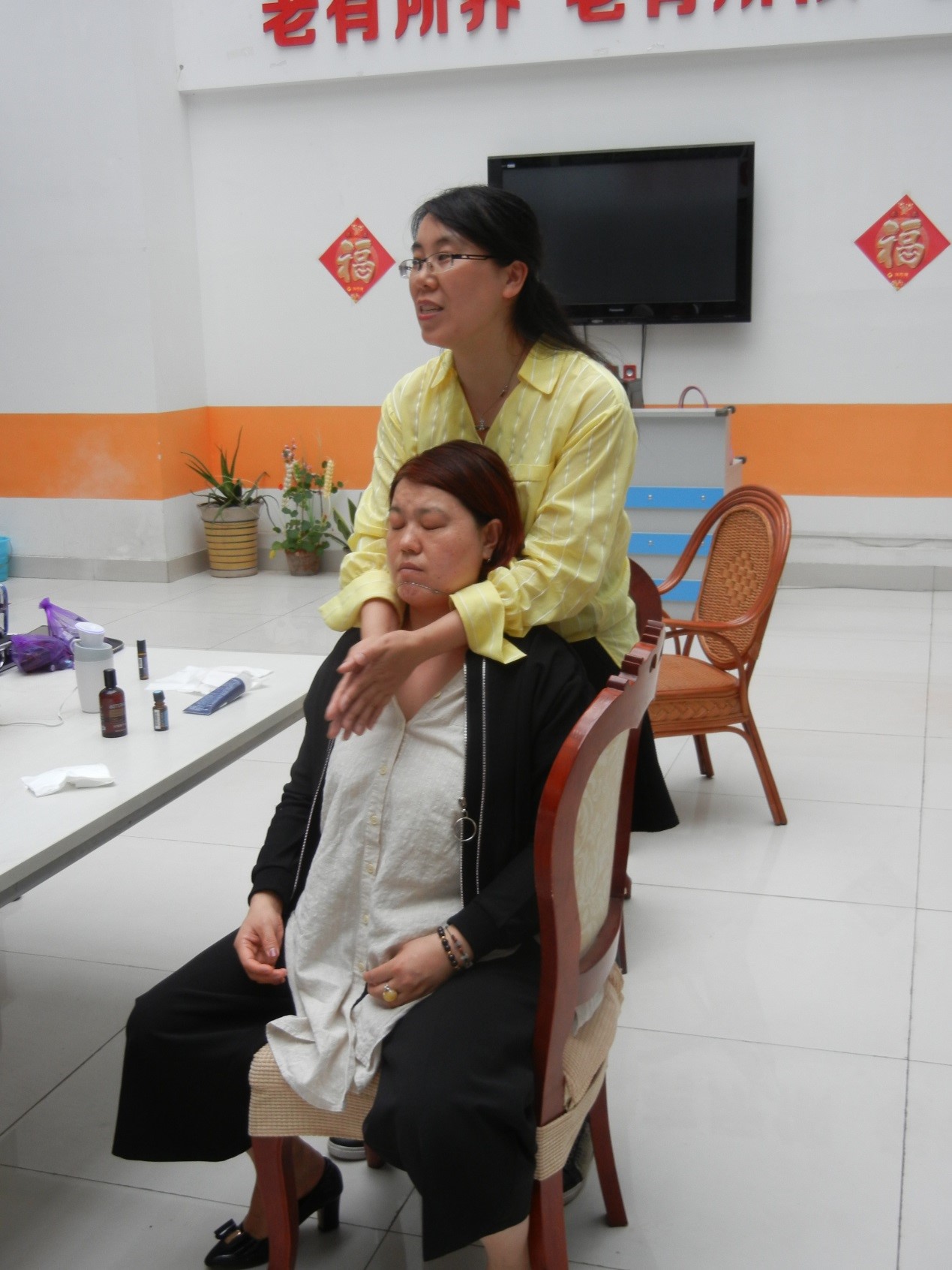 体验精油按摩的老人们精神焕发,对田蕾老师竖起大拇指,非常感谢田蕾老师的爱心。这次活动有部分老人的家属参加,他们也学到了头部按摩五手法,感觉活动非常有意义,称赞祝甸社区养老服务中心的周到服务。