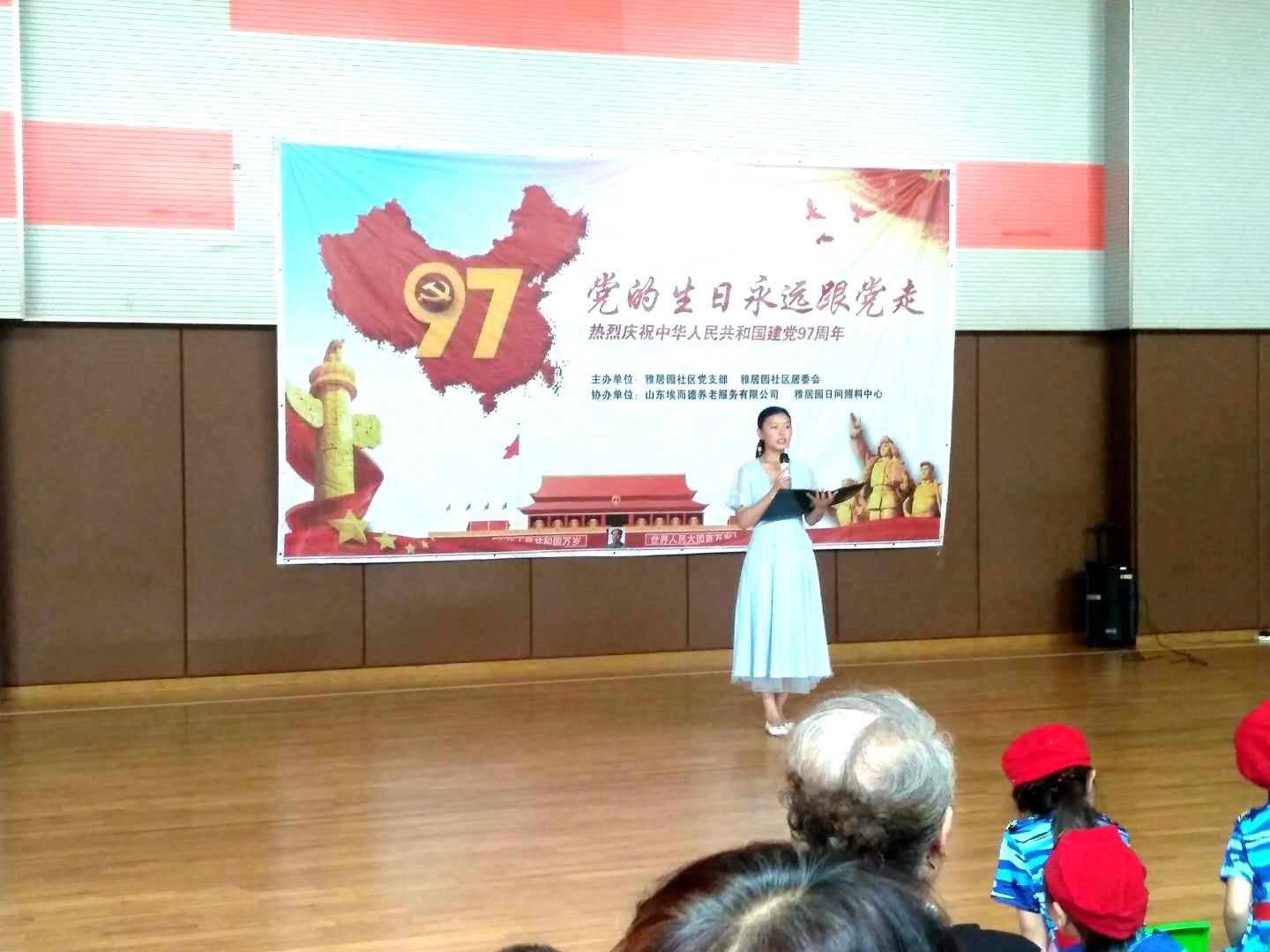 雅居园日间照料中心的人气美女毛红霞(最受老人喜爱)担任主持人,她带领大家重温党的誓词,向大家讲述了“七一”建党节的由来。